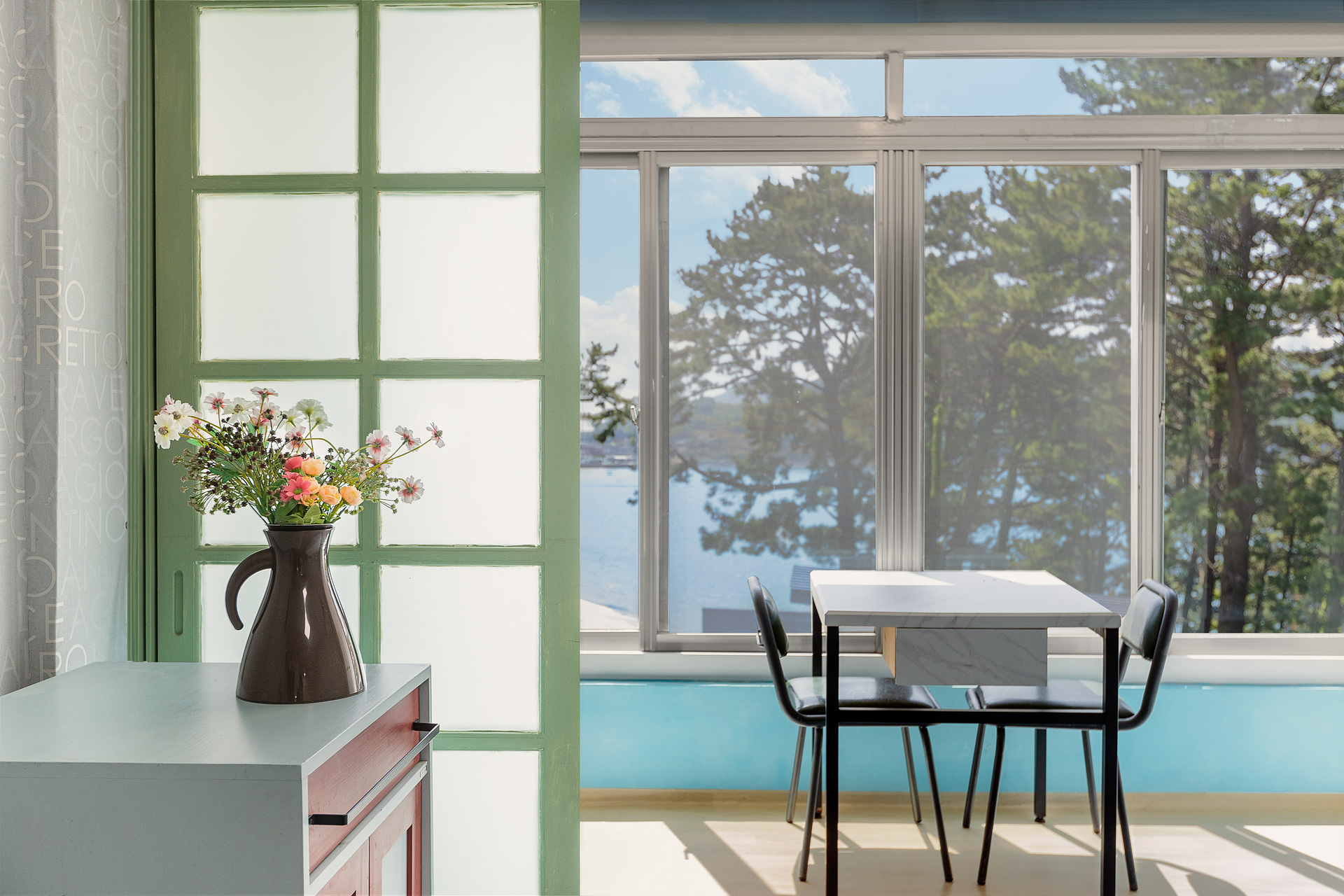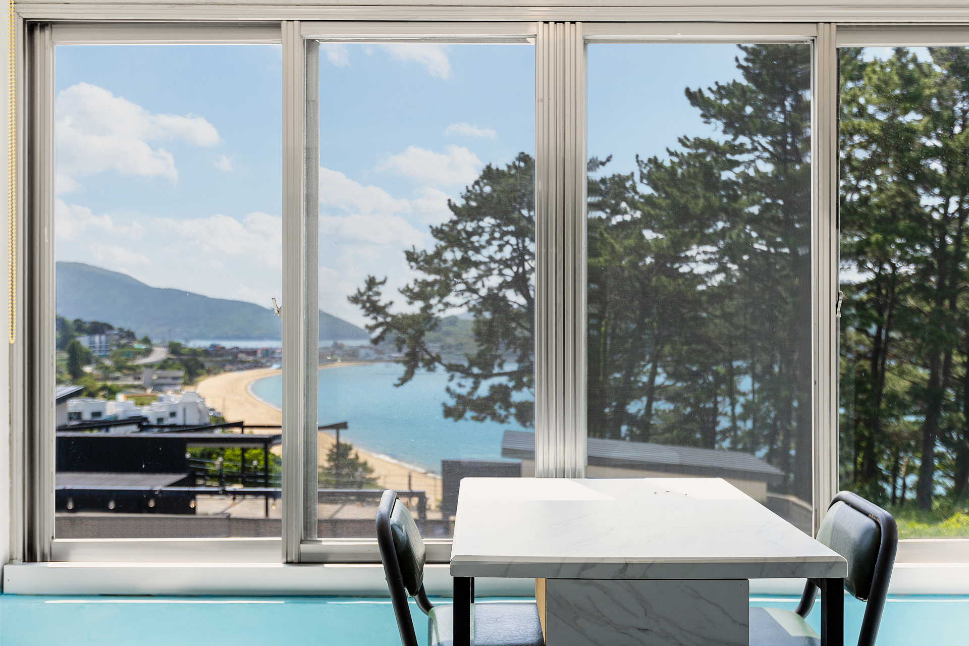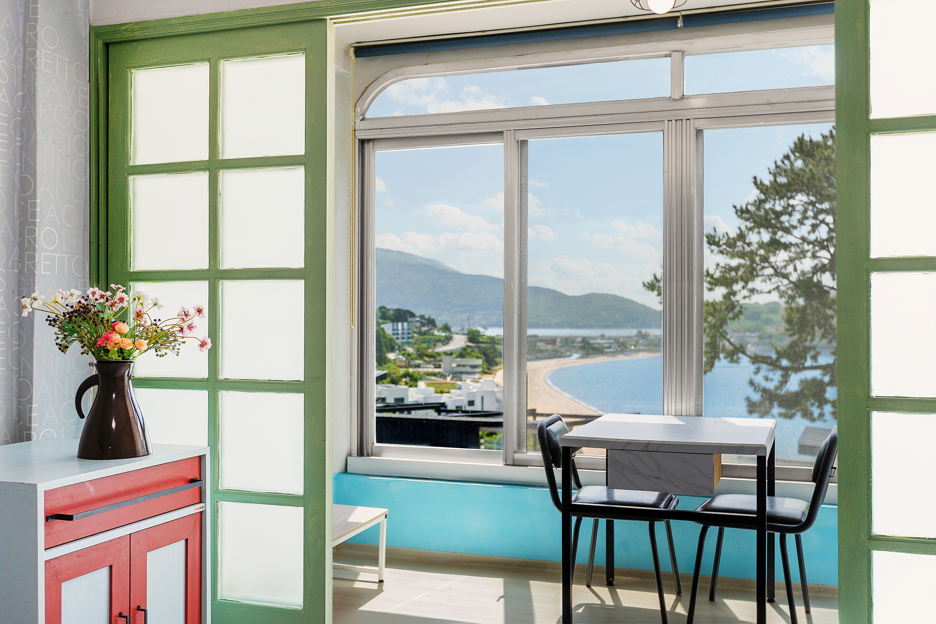 창 밖엔 푸른 휴식, 펼쳐진 파란 바다가 당신을 기다립니다.
