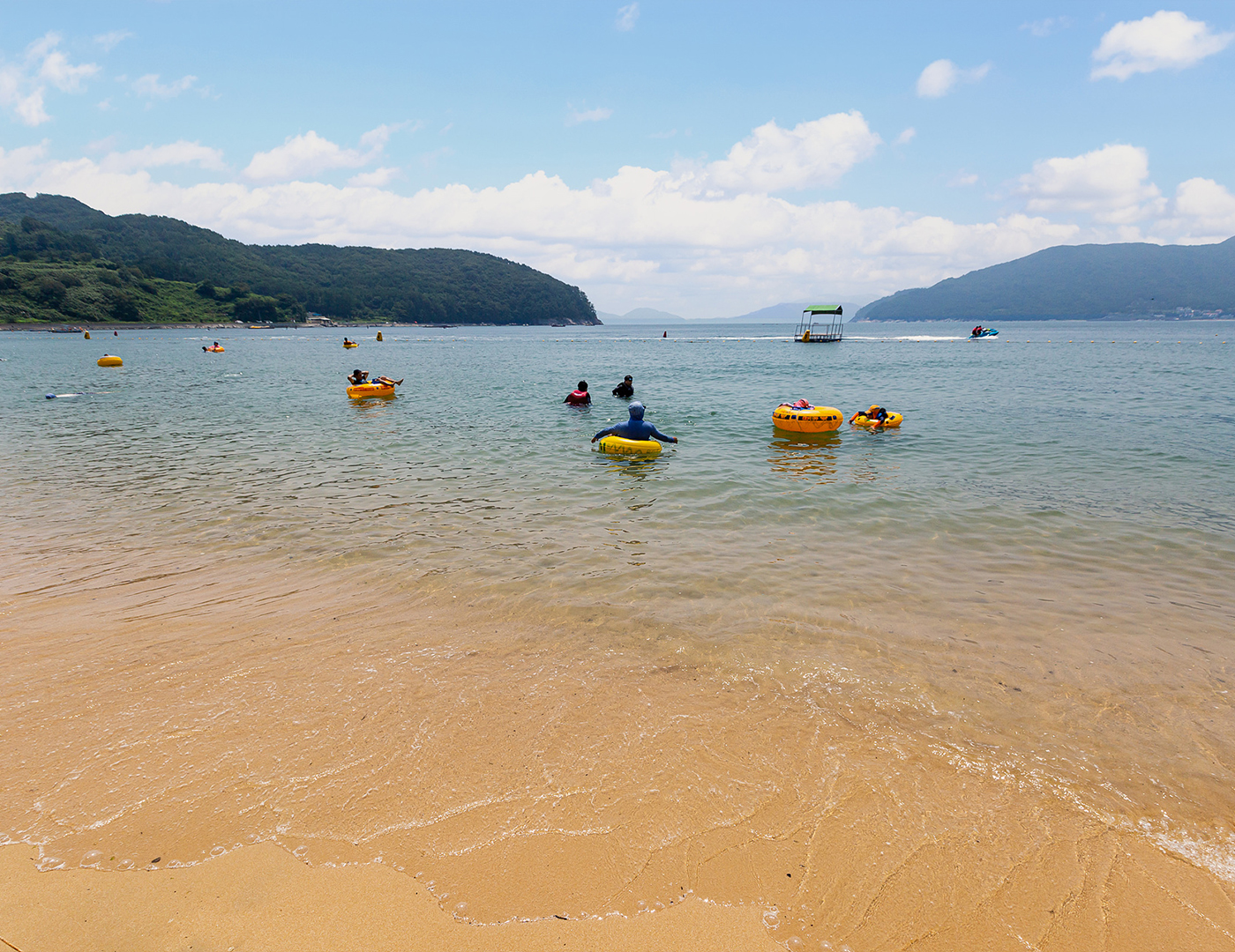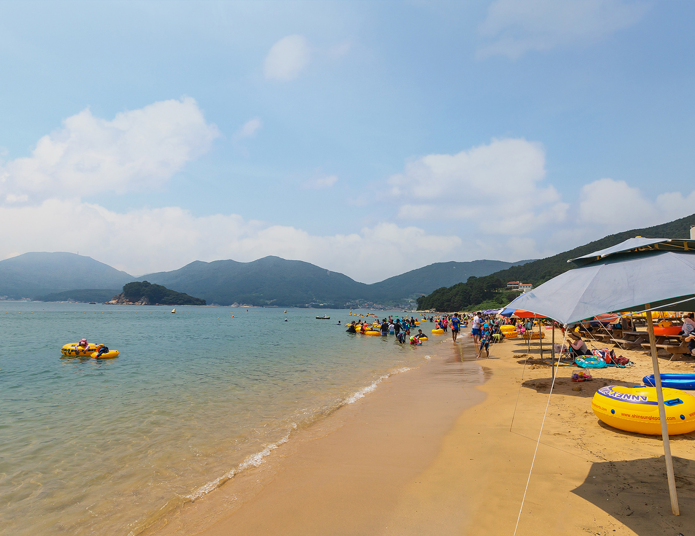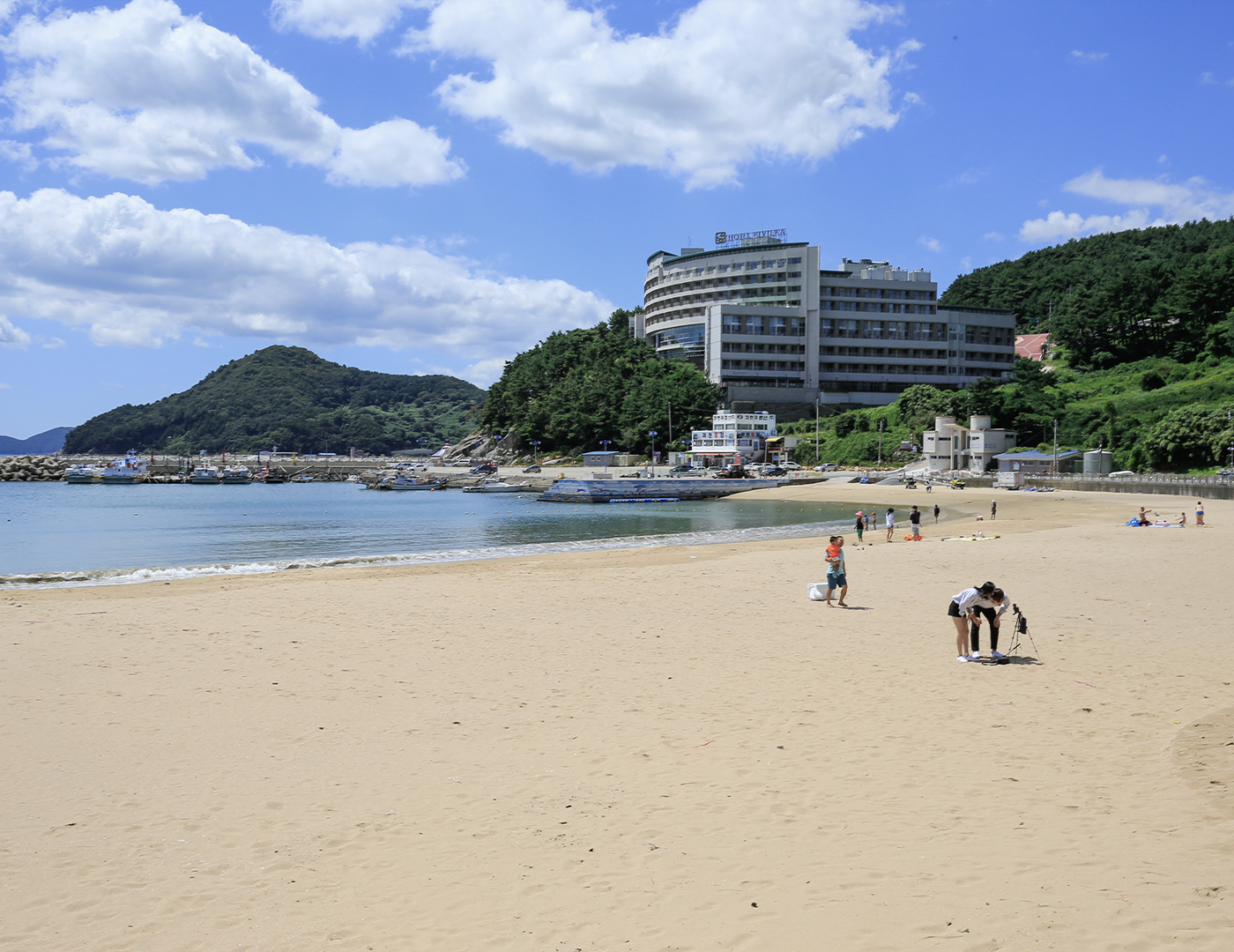 내륙형 해안으로 수심이 얕고 파도가 잔잔하며, 바닷물이 깨끗합니다. 백사장의 길이는 1.1km 폭은 30m이며 모래가 부드럽고 수심이 완만하며 수온도 적당하여 해수욕을 즐기기에 안성맞춤인 곳 입니다. 해수욕장에는 스킨스쿠버, 제트스키 등 해양 레포츠를 즐길 수 있는 시설들이 설치되어 있어 많은 관광객들이 찾고 있습니다. 해변 왼쪽으로는 구조라마을이 있고, 오른쪽으로는 유람선 선착장과 어항이 자리잡고 있습니다.